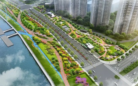 本项目位于鄞州区钟公庙街道,南起四明西路、北至堇山西路,西临奉化江,分东、西两地块,整体呈带状,占地面积约2.97万平方米。签约合同价1362.05万元,工期240日历天,涵盖景观修复、绿化提升、排水系统、海绵设施、土建智能化等施工内容。