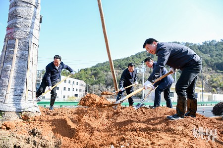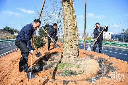 在植树现场,大家分工明确、配合默契,挥锹铲土、扶苗围堰、培实新土、提水浇灌,各环节衔接有序。经过一番热火朝天的劳动,一株株新栽种的苗木迎风挺立、错落有致,为道路沿线增添了盎然绿意与勃勃生机。